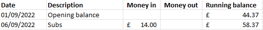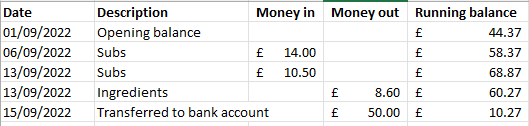 In the first line, you write “Opening balance”. If you’ve been handed a cash tin with money in, count it and write that down in your running balance column as the money in the account on September 1st. How it got there is up to whoever did the accounts for the previous years, so you don’t have to worry about it. In this demo version, I received a tin with £44.37 in there.