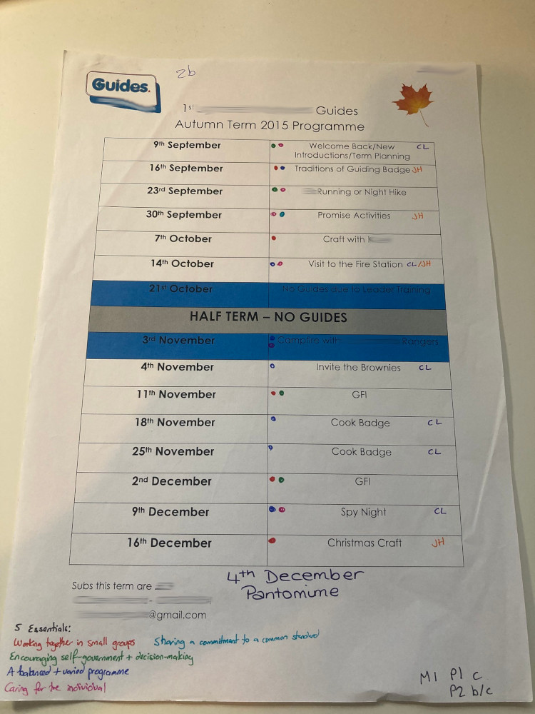 If you’ve planned a thing, maybe you have a page of notes about it? They don’t have to be tidy or orderly but a page of notes will show your planning and your thoughts really well. In my Guide qualification evidence, I planned a Look Wider-themed District Thinking Day, so I’ve got a list of the octants with an activity next to them all, the name of the person running that activity and at the bottom, lots of smaller boxes noting what we need for each activity. Things are circled, things are scribbled out, it’s not going to win any aesthetics awards (and it’s on a page of some kind of A4 medical diary, so at the bottom I’ve written “8x big octants” next to “pharmacist name”) but it shows that I planned it.